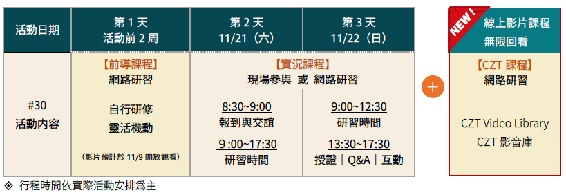 - 提供CZT專享額外預錄課程:CZT影音庫 (CZT Video Library),可無時限反覆觀看學習。